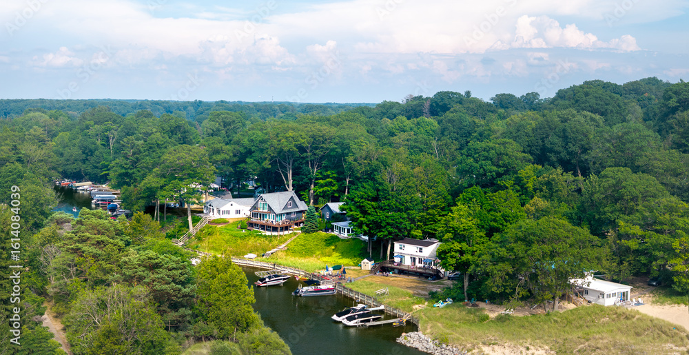 Foto Aerial View of Riverside Homes and Forest Landscape in Norton Shores, Muskegon,