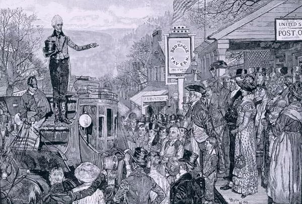 'General Jackson, president-elect, on his way to Washington', illustration from 'A Presidential Progress', pub. in Harper's Weekly, 1881