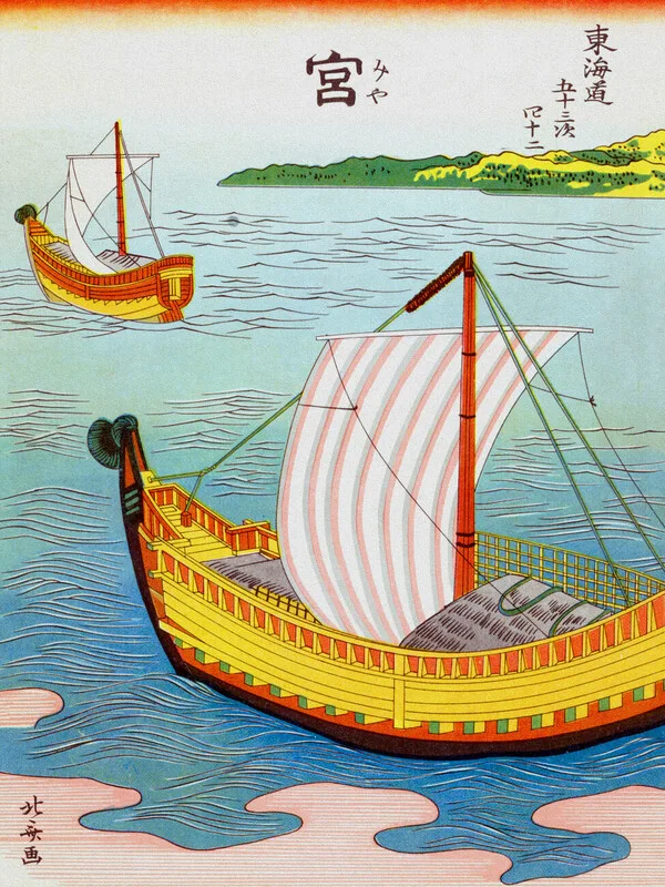 Plagát Miya-juku / Japanese Coastal Sailing Boats (Pink & Green Japandi) - Katsushika Hokusai