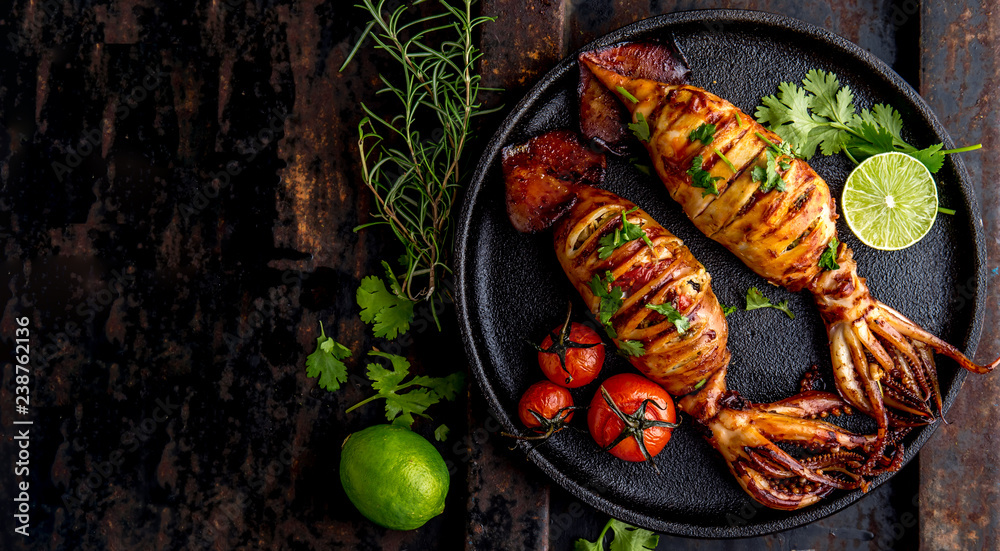 Obraz na plátne Korean BBQ squid calamary and ingredients on dark background