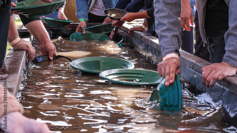 Obraz na plátne People washing gold particles in a large wooden bath using green plastic plates