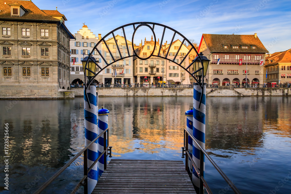 Samolepka A pier with a decorative arch and blue striped poles on the Limmat River with hi